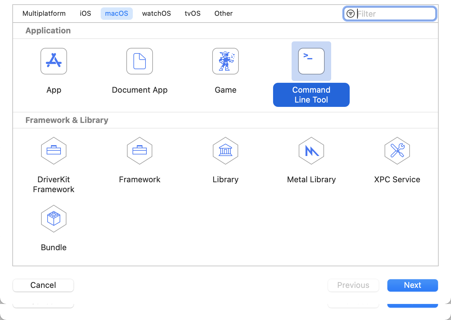 XCode에서 Project를 새로 만들었을 때, "macOS - Command Line Tool" 선택한다.