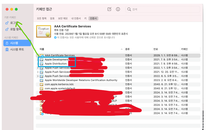 Apple 개발 인증서 2개를 선택한 후에 복사 -> 로그인 항목에 가서 붙여넣기를 하면 된다.