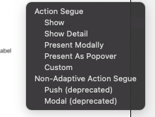 그리고 종류를 Present Modally로 해주면 된다. 그리고 presentation 옵션을 여러가지로 지정할 수도 있다.