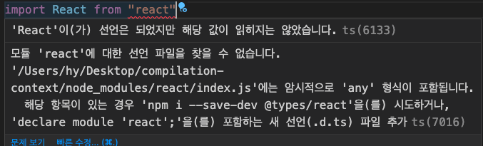 예를 들어서, 타입스크립트에서 React를 가져다 쓸 경우 아래와 같은 오류를 보임