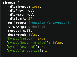 var gangwon = { resorts: ["Kirkwood","Squaw","Alpine","Heavenly","Northstar"], print: function(delay=1000) { setTimeout(function() { console.log(this.resorts.join(",")) }, delay) } } gangwon.print()실제로 setTimeout안에서 this를 찍어보면 다음과 같은 결과를 보여준다.