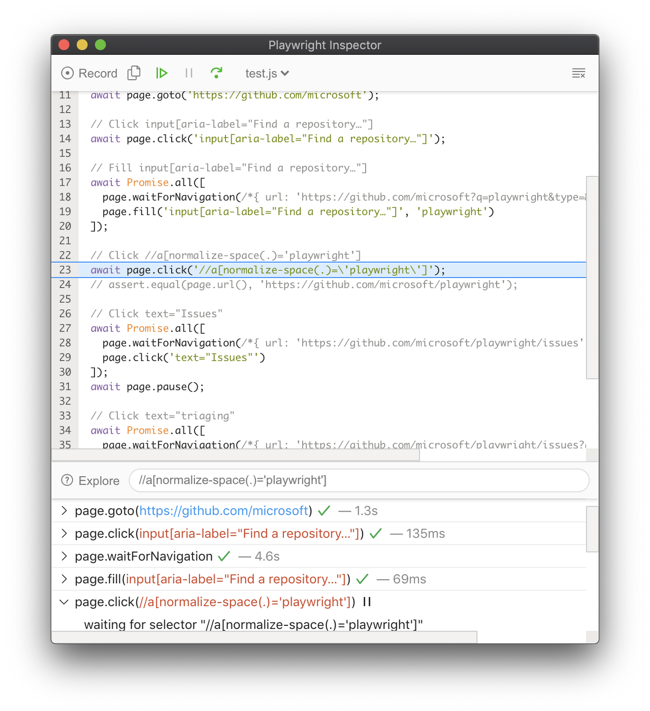 Playwright를 debug 모드로 실행시켜 한단계씩 진행가능하게 한다.