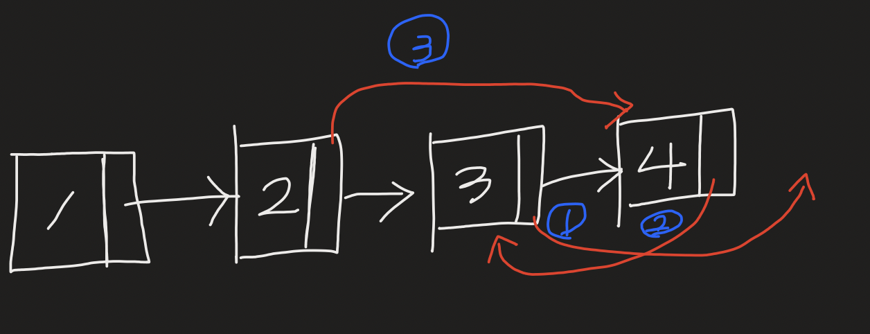 그림에서 3->4를 교환한다고 하면 3의 next를 4의 next로 바꿔야하고(1),
